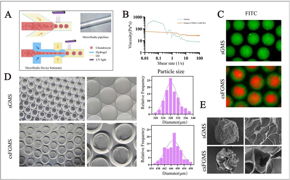 2、研究先通过微流控技术制备出两种软骨细胞微球(单通道GelMA微球sGMS和HAMA壳-鱼明胶核的核壳结构微球csFGMS),它们均具有均一尺寸和良好生物相容性,能维持软骨细胞表型并促进细胞外基质(ECM)分泌,且csFGMS性能更优。随后将这些微球与GelMA/CSMA/ColIIMA复合水凝胶混合制成生物墨水,通过挤压式3D生物打印构建网格状支架。