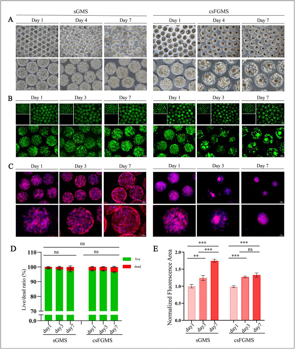 sGMS 为单通道均质结构,由 15% GelMA+0.3% LAP 组成,直径 328±4μm;csFGMS 为核壳结构,外壳为 HAMA(甲基丙烯酰化透明质酸),核心为鱼明胶 + 细胞,直径 447±4.6μm。