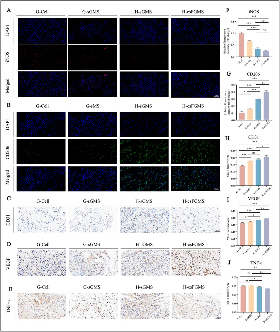 3、体外实验表明,复合水凝胶支架力学性能、降解性和细胞相容性良好,能支持软骨细胞增殖、迁移和软骨相关基因与蛋白表达。体内实验中,该支架在裸鼠皮下移植后,尤其是混合核壳微球的复合支架(H-csFGMS),可促进原位软骨再生和ECM沉积,再生组织在形态、组织学特征和力学强度上均接近天然耳廓软骨,还能调节免疫微环境、促进血管生成并减轻炎症反应。