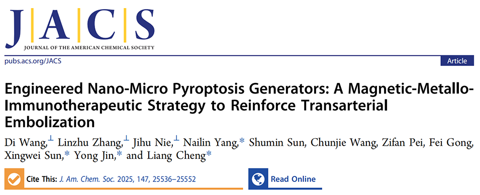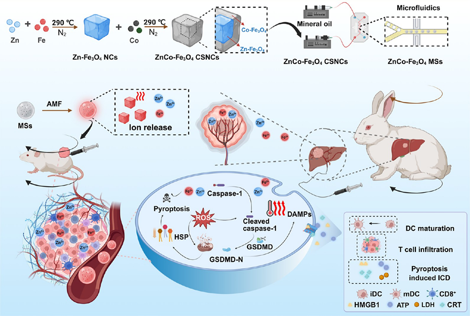 近期,苏州大学程亮、杨乃霖团队与靳勇、孙兴伟团队合作开发了一种创新的磁-金属-免疫治疗策略。通过成分与结构优化,合成磁热性能优异的ZnCo-Fe₃O₄核壳纳米立方体(CSNCs),经微流控技术组装为尺寸可调的磁性微球(MSs),其兼具经动脉栓塞(TAE)与磁热疗法(MHT)功能;在交变磁场作用下,该磁性微球的磁-金属-免疫调控能力显著诱导癌细胞焦亡,激活免疫反应,进一步增强TAE对肝癌的治疗效果。相关研究以“Engineered Nano-Micro Pyroptosis Generators: A Magnetic-Metallo-Immunotherapeutic Strategy to Reinforce Transarterial Embolization”为题目,发表于期刊《Journal of the American Chemical Society》。