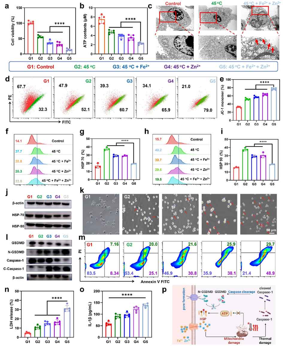 4、焦亡诱导:Fe²⁺/Zn²⁺与热疗产生协同作用,激活半胱天冬酶-1,该酶会切割Gasdermin D蛋白,在肿瘤细胞膜上形成穿孔,最终诱导肿瘤细胞发生焦亡(一种具有炎症效应的程序性死亡)。