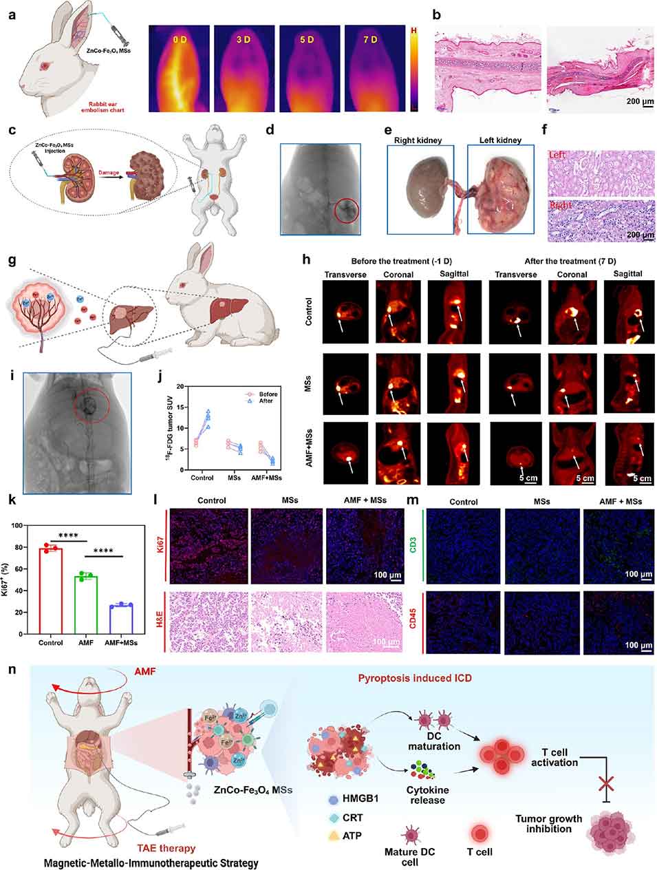 图7. ZnCo-Fe₃O₄磁性微球(MSs)在兔肝癌模型中的经动脉栓塞(TAE)-磁-免疫联合治疗研究。