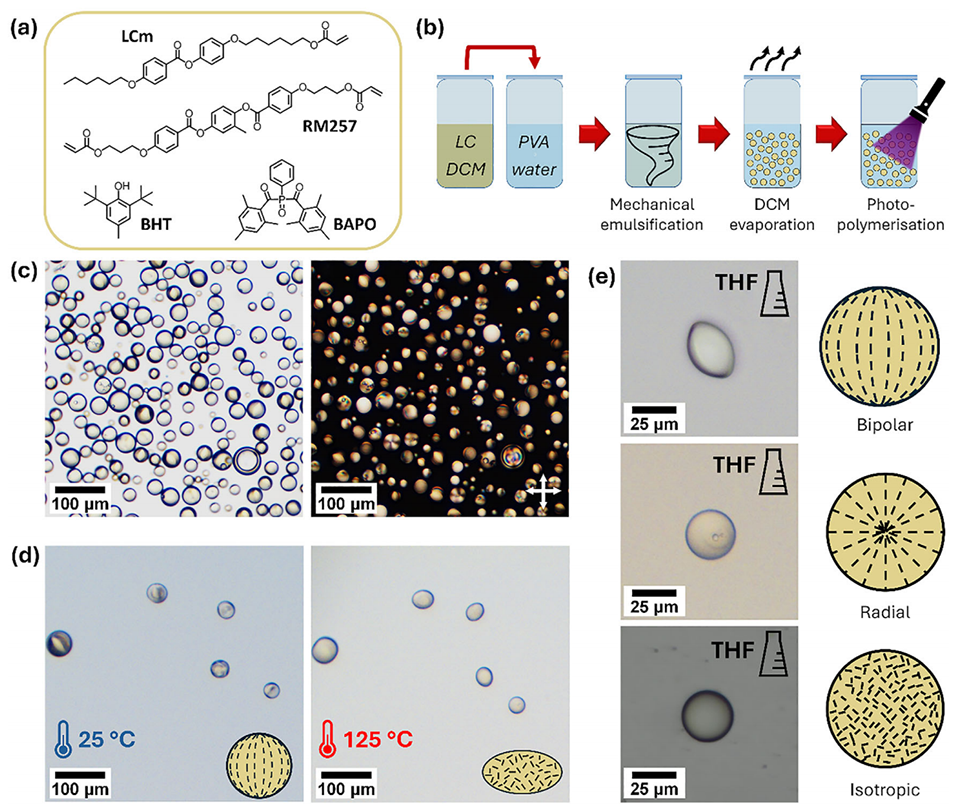 图2 单相乳液制备的液晶网络(LCN)微颗粒。(a) 可聚合液晶单体(LCm)与交联剂(RM257)的化学结构,其中交联剂 RM257 的含量为 5-20 wt.%。(b) 批量乳化法制备液晶液滴并通过光聚合转化为 LCN 微颗粒的流程示意图。(c) 含 10 wt.% RM257 的液滴在明场(左)和正交偏振光(右)下的偏振光学显微镜(POM)图像,显示双极取向结构。(d) 含 10 wt.% RM257 的 LCN 微颗粒的热致驱动行为,加热后从球形可逆转变为扁球形。(e) 不同内部取向的 LCN 颗粒在四氢呋喃(THF)中的溶胀行为(从上至下:双极取向、径向取向、各向同性取向)。