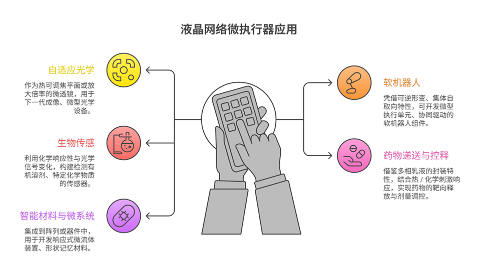 5、本研究建立了一条稳健且可重复的复杂多功能LCN微执行器规模化制备路径,为自适应光学、软机器人和响应式微系统等领域开辟了新的应用前景,未来还将拓展其对光、pH值和化学信号的响应性,并探索阵列集成与器件化应用。