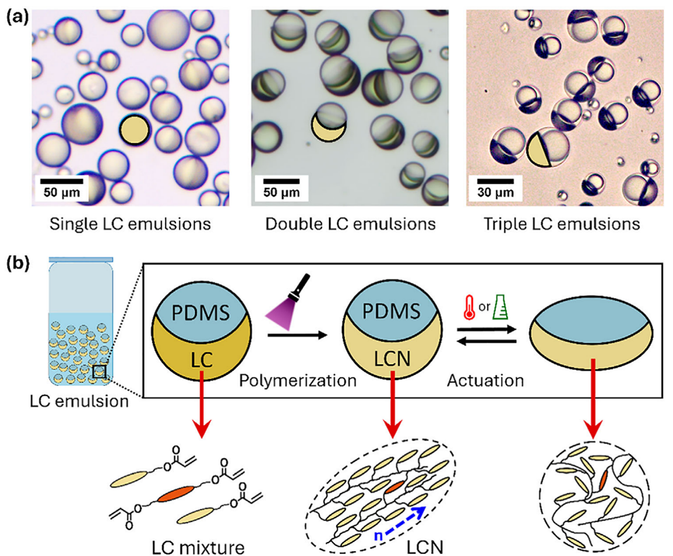 图1 用于制备刺激响应型程序化驱动微颗粒的复杂液晶乳液。(a) 批量乳化法制备的乳液光学显微镜图像:单相、双相(Janus 型)及三相乳液,其中液晶相以黄色突出显示。(b) 液晶网络(LCN)微颗粒的制备流程及其在微观和分子层面的驱动行为示意图。