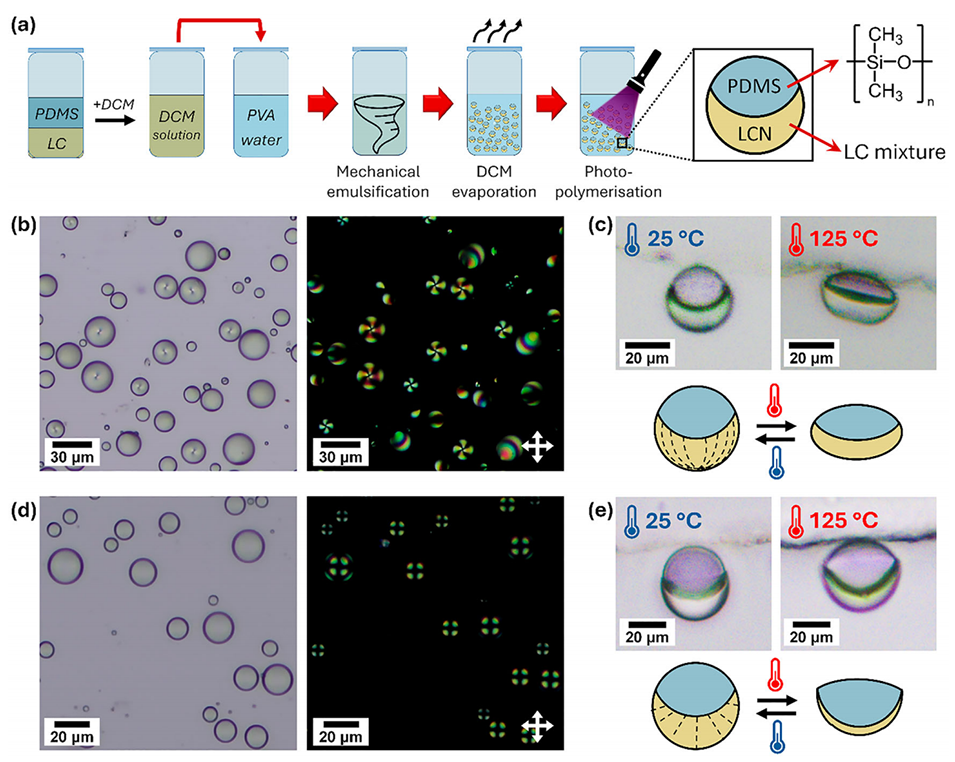 图3 双相乳液制备的液晶网络(LCN)微执行器。(a) 用于制备双相液晶/聚二甲基硅氧烷(PDMS)乳液液滴的批量乳化法及相关组分示意图。(b) Janus 液滴在明场(左)和正交偏振光(右)下的偏振光学显微镜(POM)图像,显示 LCN 半球为单极取向结构。(c) 具有单极液晶取向的 Janus 型 LCN 颗粒的热致驱动行为,从类球形可逆转变为扁球形。(d) Janus 液滴在明场(左)和正交偏振光(右)下的偏振光学显微镜(POM)图像,显示 LCN 半球为径向取向结构。(e) 径向取向 Janus 颗粒的热致驱动行为,形成 PDMS 相包裹于 LCN 半球内的花瓶状形变。