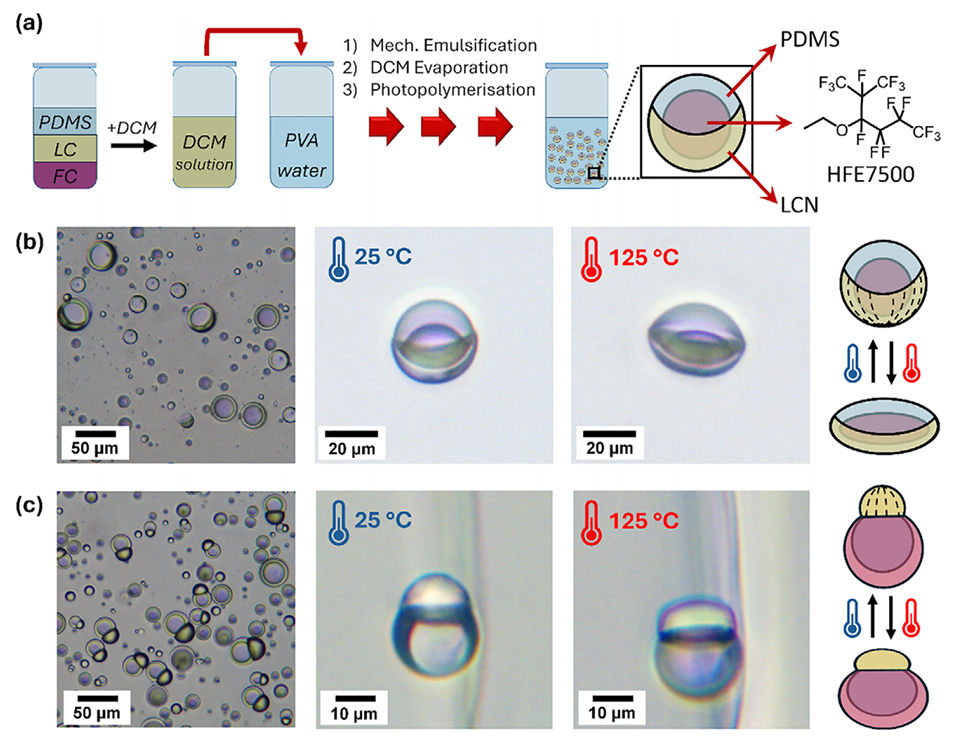 图4 三相乳液制备的液晶网络(LCN)微颗粒。(a) 用于制备三相液晶/聚二甲基硅氧烷(PDMS)/HFE-7500 乳液液滴的批量乳化法及相关组分示意图。(b) 球形三相液滴的光学显微镜图像及其热致可逆驱动行为。(c) 雪人状三相液滴的光学显微镜图像及其对应的热致驱动行为。