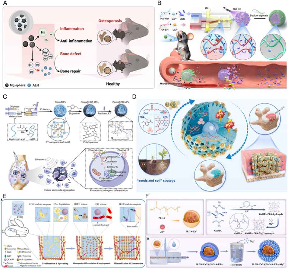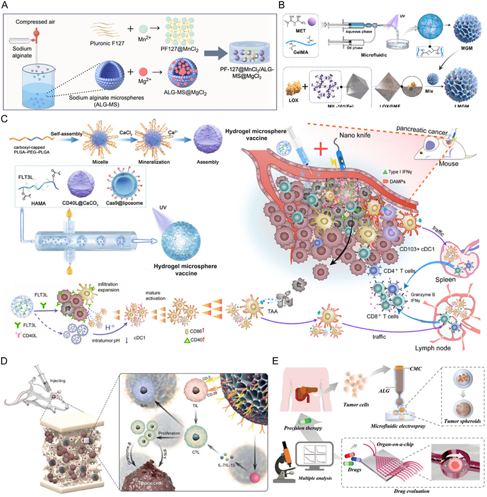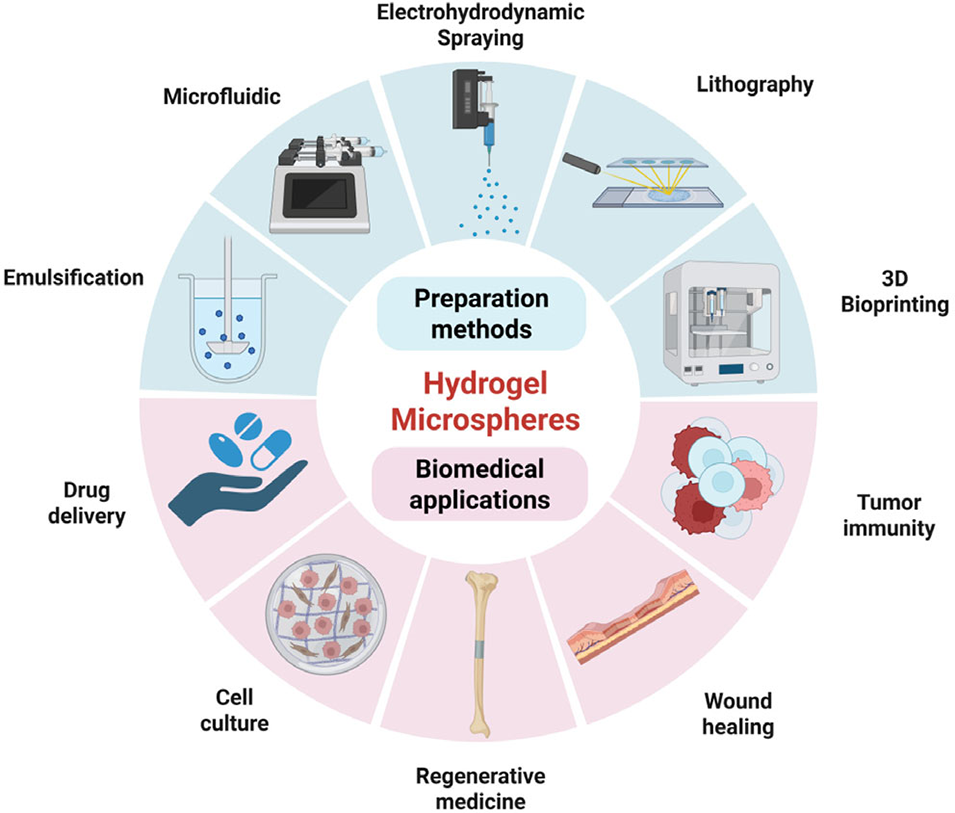 近年来,水凝胶成型技术取得了显著进展,并在生物医学领域得到了广泛应用。水凝胶作为一种三维聚合物网络结构,由亲水性聚合物组成,能够吸收并保留大量水分,同时保持其结构完整性和类似软组织的特性。然而,传统的块状水凝胶由于其毫米级的尺寸,在应用中常面临需要侵入性植入、营养扩散效率低以及细胞分布不均等问题。为了克服这些挑战,微米和纳米尺度的水凝胶结构,如微球(HMs),逐渐成为研究热点。HMs具有高比表面积、可调的机械性能和较大的设计灵活性,是实现特定生物功能的理想材料。