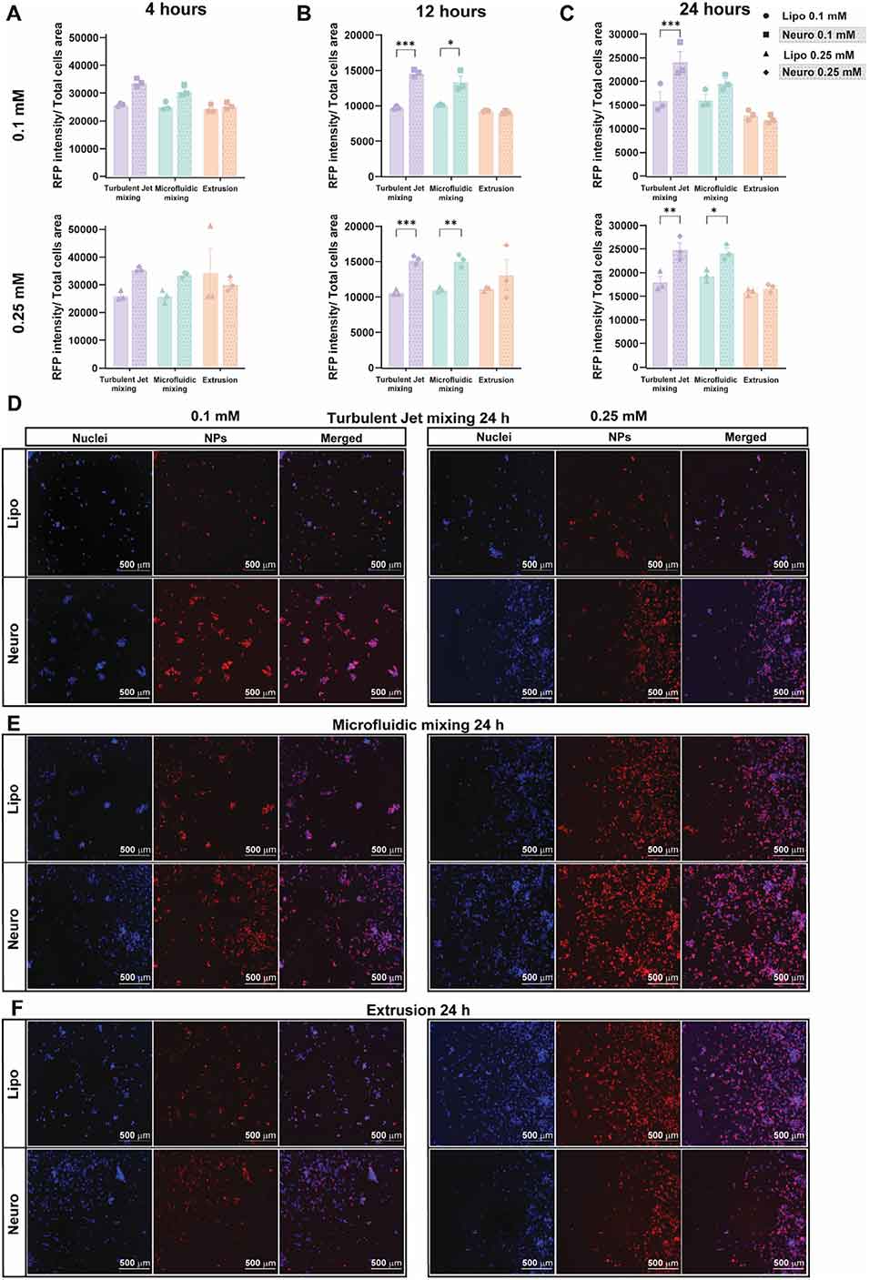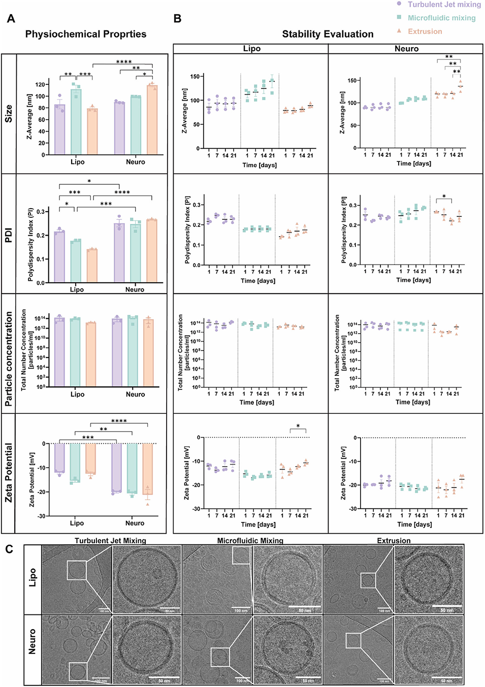 1、该研究聚焦仿生纳米颗粒(BNPs)的制备方法优化,以神经元来源的BNPs为模型,系统对比了湍流射流混合、微流控混合和挤出三种制备方法的性能。