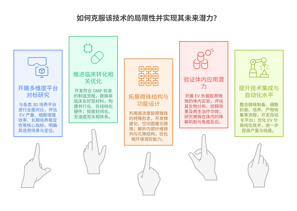 4、该技术整合了可调节性、高吞吐量和功能扩展性,为组织建模、药物测试及治疗性EV生物制造等领域提供了多功能平台,但目前仍局限于实验室规模,需优化以符合GMP标准;未来需开展与其他3D培养系统的对比研究,并探索其体内应用潜力。