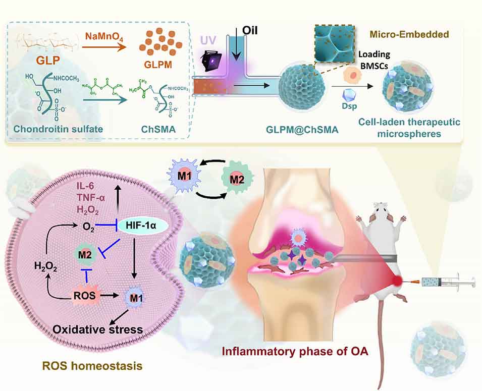 6、该可注射水凝胶微球通过抗氧化、抗炎和再生功能的协同作用,为OA提供了一种微创、多靶点的局部治疗策略,有望推动慢性肌肉骨骼疾病的精准给药与细胞疗法发展。