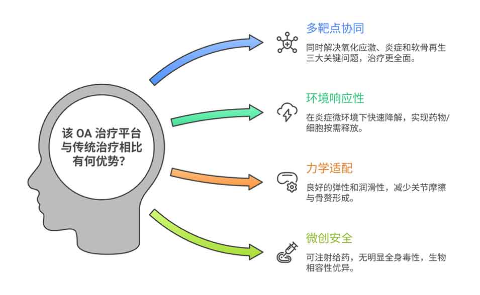 3、核心挑战:OA病理涉及氧化应激(ROS积累)、炎症反应、软骨再生能力不足等多环节,需开发多靶点整合型治疗平台。