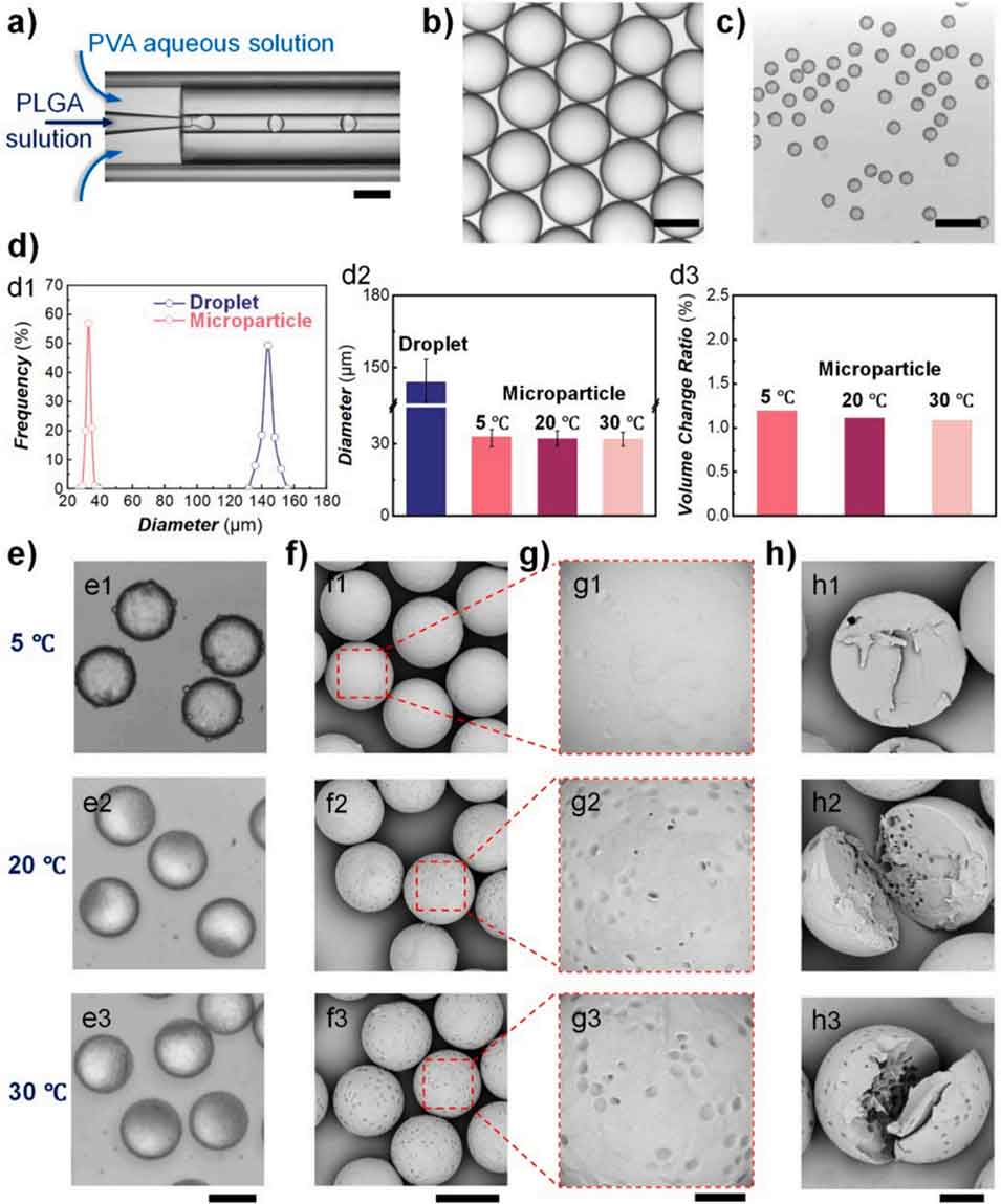 图2 通过温度调控可控制备仿生聚乳酸-羟基乙酸共聚物(PLGA)微粒。PVA 浓度为 5%(质量体积比)。