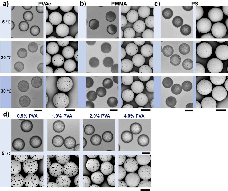 图3 通过调节孵育温度和 PVA 浓度可控制备仿生聚乙酸乙烯酯(PVAc)、聚甲基丙烯酸甲酯(PMMA)和聚苯乙烯(PS)微粒。