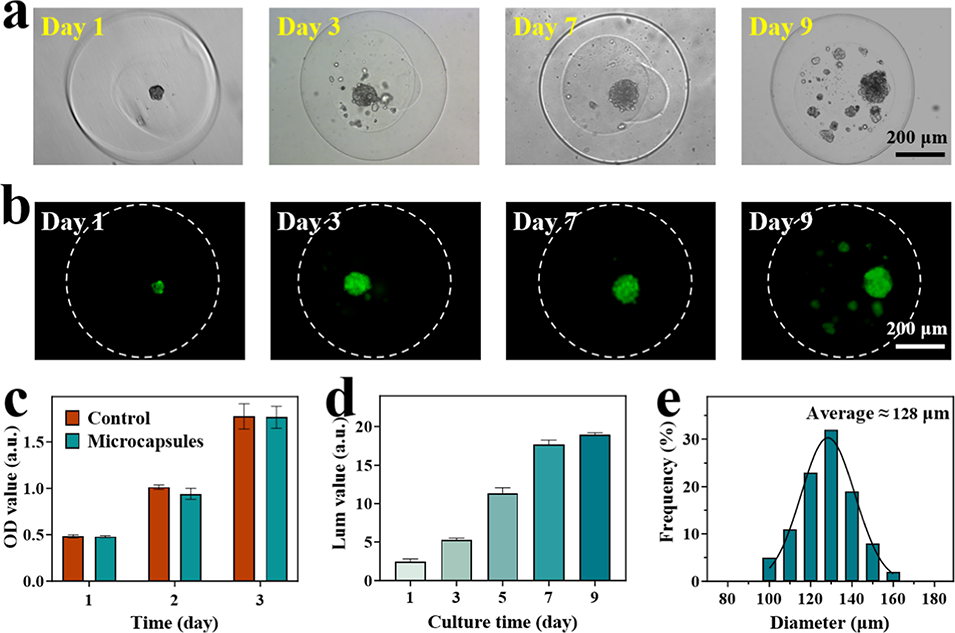 图3 CMC/海藻酸盐微胶囊封装肿瘤球状体的形成与评估。(a)封装的肿瘤球状体随时间(第1、3、7、9天)变化的明场光学显微镜图像;(b)相应的活/死染色结果;(c)CCK-8检测法分析微胶囊对肿瘤球状体活力影响的统计数据;(d)肿瘤球状体增殖的定量分析(第1、3、5、7、9天),发光信号(Lum)与ATP浓度及细胞数量相关(每组n=6);(e)第9天肿瘤球状体的直径分布(n=100)。