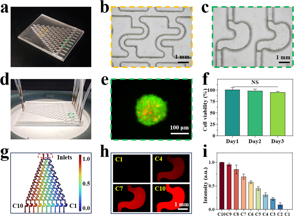 图5 (a)微流控芯片的实物照片;(b)梯度发生器结构的明场观察图像;(c)培养室结构的明场观察图像;(d)液体进出芯片的流动照片;(e)肿瘤球状体在培养室中培养3天后的活/死染色结果;(f)肿瘤球状体接种到芯片后细胞存活率的定量分析(每组n=10);(g)微流控芯片中药物浓度分布的数值分析结果;(h)罗丹明B在1、4、7、10号微通道中分布的荧光图像;(i)在微流控通道C1至C10的培养室中测得的罗丹明B荧光强度(数据已进行归一化处理)。