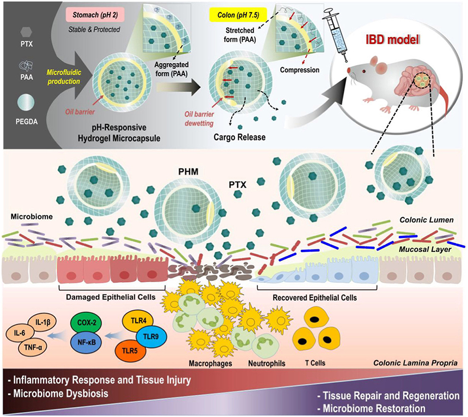 1、该研究开发了一种基于三重乳液微流控技术的pH响应型核壳水凝胶微胶囊(PHM),用于口服递送己酮可可碱(PTX)以治疗炎症性肠病(IBD)。