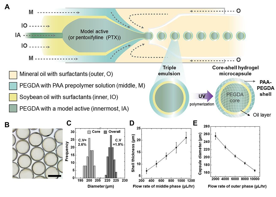 图1. 基于三重乳液微流控技术制备负载PTX的核壳水凝胶微胶囊。(A)示意图展示了实现PAA-PEGDA壳层微胶囊可靠制备的微流控装置。(B)制备的负载PTX胶囊的光学显微镜图像,显示出均一的球形形貌。比例尺代表200μm。(C)通过图像分析获得的核层和壳层尺寸测量图表。(D)壳层厚度随中间相流速变化的图表,证实了水凝胶屏障的可控调节。(E)胶囊直径随连续相流速变化的图表,验证了胶囊尺寸的流体动力学调控。