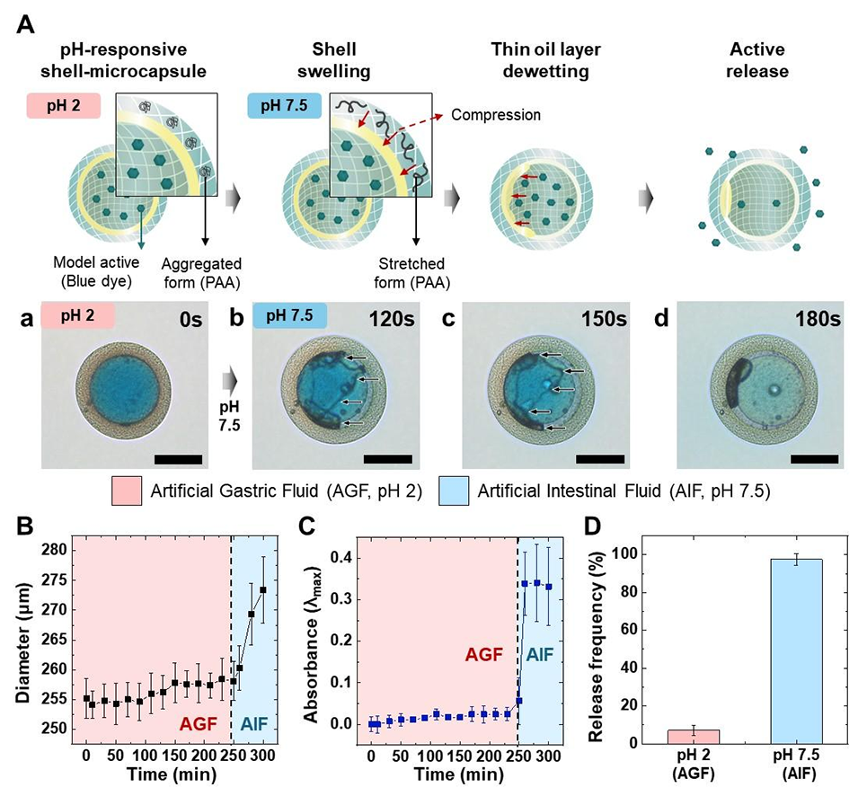 图2. 用于靶向药物递送的pH响应型水凝胶微胶囊。(A)示意图展示了释放机制:PAA-PEGDA壳层的pH响应型溶胀以及随后油层的破裂,最终实现活性物质的释放。负载PTX的胶囊在酸性(pH2,人工胃液)和碱性(pH7.5,人工肠液)条件下的光学显微镜图像:(a)pH2时形貌稳定;(b)120s时油层开始破裂;(c)150s时破裂持续进行;(d)180s时完全破裂并释放染料。比例尺为100μm。(B)胶囊在人工胃液(pH2)中随后转入人工肠液(pH7.5)后的时间依赖性直径变化。(C)封装染料的吸光度测量结果,显示在人工胃液中释放量可忽略,在人工肠液中快速释放。(D)胶囊在酸性和碱性条件下的释放频率,证实其在人工胃液中结构稳定,在人工肠液中选择性释放。
