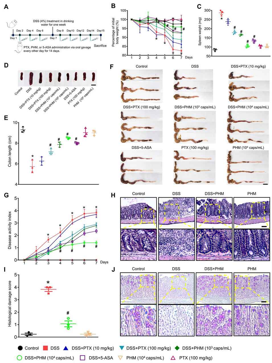 图4. PHM缓解IBD症状的治疗效果。(A)ICR雄性小鼠(n=5)每两天口服给药PTX(10或100 mg/kg)、PHM(10³或10⁴个胶囊/mL,相当于10或100 mg/kg PTX)或标准IBD药物5-ASA(200 mg/kg),持续14天。从第7天开始,在饮用水中加入4%DSS,持续7天以诱导急性结肠炎。对照组小鼠全程饮用不含DSS的常规饮用水。(B-C)测量体重和脾脏重量的变化。*p≤0.05 vs对照组,#p≤0.05 vs DSS组。n=5。(D)脾脏的代表性图像。比例尺为1cm。(E)PHM对结肠长度的影响。*p≤0.01 vs对照组,#p≤0.01 vs DSS组。n=3。(F)结肠的代表性图像。比例尺为1cm。(G)实验期间记录的疾病活动指数(DAI)评分。*p≤0.01 vs对照组,#p≤0.05 vs DSS组。n=5。(H)结肠组织HE染色的代表性切片。比例尺为100μm(放大倍数×100)。(I)评估组织学损伤评分。*p≤0.01 vs对照组,#p<0.01 vs DSS组。n=3。(J)结肠组织PAS染色的代表性切片。比例尺为100μm(放大倍数×100)。