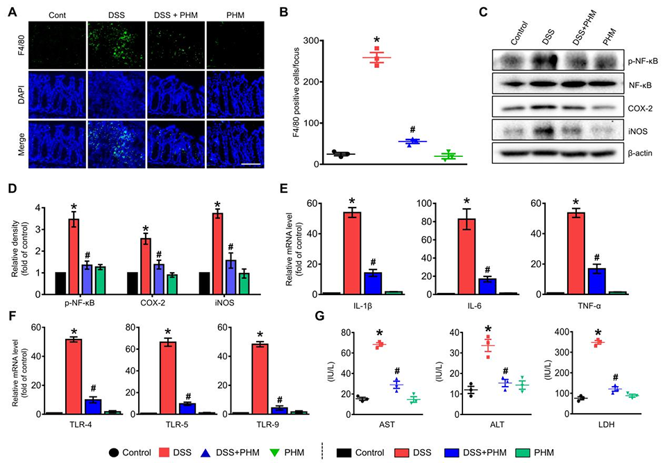 图5. PHM缓解DSS诱导的小鼠IBD模型结肠炎症的治疗效果。(A)通过共聚焦显微镜观察结肠中促炎F4/80⁺巨噬细胞的表达(绿色),细胞核采用DAPI染色(蓝色)。比例尺为100μm(放大倍数×200)。n=3。(B)每视野F4/80⁺巨噬细胞的定量结果。*p≤0.01 vs对照组,#p≤0.01 vs DSS组。n=3。(C-D)通过蛋白质印迹分析评估磷酸化NF-κB(p-NF-κB)、COX-2和iNOS的蛋白表达水平,以评价炎症信号通路。*p≤0.01 vs对照组,#p≤0.01 vs DSS组。n=5。(E-F)测量促炎细胞因子和Toll样受体(TLR)的水平,以确定PHM的调控作用。*p≤0.001 vs对照组,#p≤0.01 vs DSS组。n=5。(G)血清中组织损伤标志物(AST、ALT和LDH)的水平,用于评估全身毒性。*p≤0.001 vs对照组,#p≤0.01 vs DSS组。n=3。