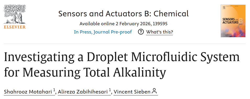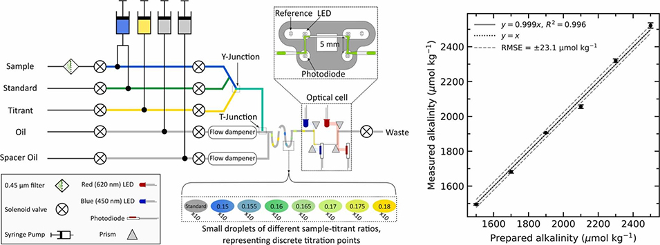 近期,近期,加拿大戴尔豪斯大学研究团队成功开发出首台基于液滴微流控技术的海水总碱度(TA)传感器。该传感器融合芯片上吸光度检测与多点分光光度滴定技术,每个微液滴均作为独立滴定点,在显著降低试剂消耗与功耗的同时,保持了与现有原位系统相当的测量精度,为实现高分辨率、长期稳定的海洋总碱度监测提供了具有变革潜力的技术平台。相关研究以“Investigating a Droplet Microfluidic System for Measuring Total Alkalinity”为题目,发表在期刊《Sensors and Actuators B: Chemical》上。