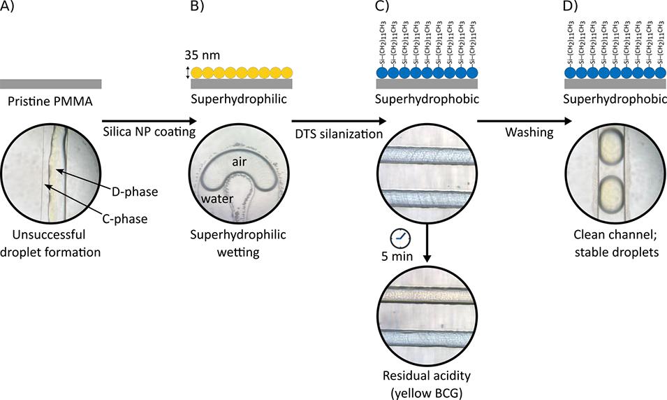 图2. 液滴微流控芯片涂层工艺。(A) 原始PMMA芯片因通道具有亲水性,无法稳定生成液滴。(B) 上图:通过冲洗二氧化硅纳米颗粒溶液并进行热处理,在通道表面沉积纳米颗粒,使通道呈现超亲水性(静态水接触角<10°),该流程重复四次以确保纳米颗粒完全覆盖。下图:水能够完全润湿通道且水相中存在稳定气泡,表明超亲水改性成功。(C) 上图:采用三氯十二硅烷(DTS)对二氧化硅涂层进行化学改性,使通道转变为超疏水状态(静态水接触角>150°)。下图:DTS改性后向芯片注入蓝色溴甲酚绿(BCG)溶液,多数区域呈现黄色,表明涂层过程中残留酸性物质。(D) 上图:用己烷和去离子水对通道清洗三次。中图:成功生成液滴,十六烷完全润湿微通道。下图:蓝色BCG溶液保持颜色不变,证实酸性副产物已完全去除。
