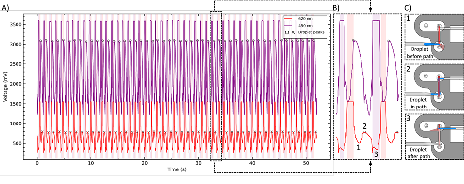 图3. 记录的光电二极管信号。(A) 50个液滴通过620nm和450nm光学池时的光电二极管电压信号(认证参考物质(CRM)的总碱度TACRM=2199.32±0.79 μmol kg−1,稀释因子:0.18)。通过定制Python算法识别液滴峰值(叉号和圆圈标记)及油相基线水平(红色和紫色高亮区域),用于计算吸光度。(B) 放大视图显示,液滴进入和离开光学池时,因油-液滴界面的光折射导致电压骤降;当液滴完全占据光程时,信号保持稳定。(C) 过渡过程中的折射机制示意图:(1) 液滴进入光学池时的光衰减;(2) 液滴充满光程时的稳定信号;(3) 液滴离开时的光衰减。