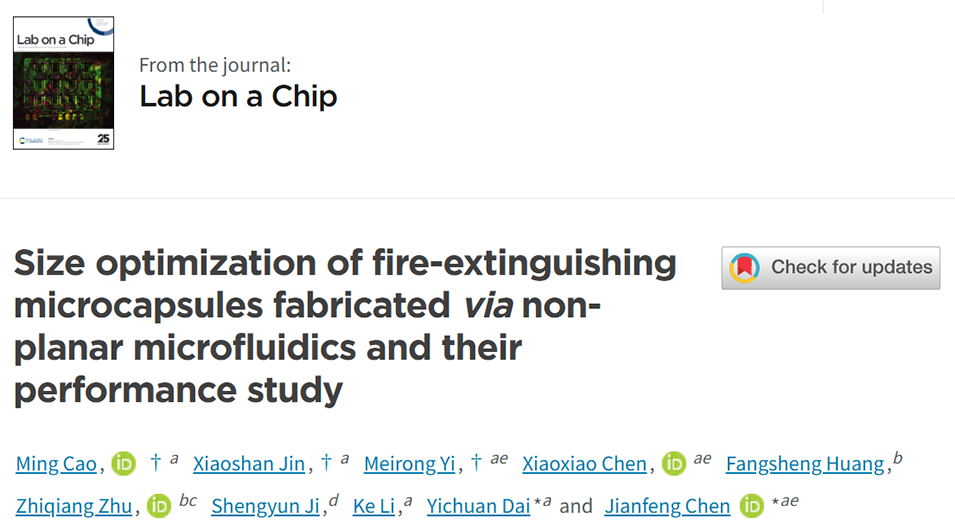 近期,南昌大学先进制造学院陈建锋副教授、戴一川副教授等人利用非平面微流控策略,成功制备出具有可控结构与热响应特性的水基灭火微胶囊。该微胶囊在热触发下能迅速释放细水雾,并通过贴片形式实现快速灭火,兼具环境友好与高效定向释放的优势,为电气设备等狭小空间的火灾防控提供了极具潜力的技术方案。相关研究以“Size optimization of fire-extinguishing microcapsules fabricated via non-planar microfluidics and their performance study”为题目,发表于期刊《Lab on a Chip》。