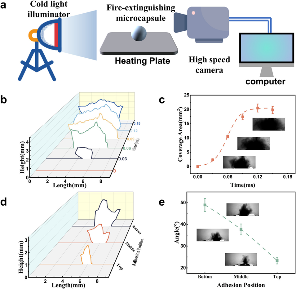 图3 水基微胶囊的破裂特性及细水雾释放行为:(a) 观测微胶囊破裂过程的实验装置示意图;(b) 不同时间点破裂覆盖面积的三维轮廓图;(c) 微胶囊破裂覆盖面积的时间变化规律;(d) 不同粘贴位置下的三维破裂轮廓对比;(e) 水雾释放角度与粘贴位置的关系。