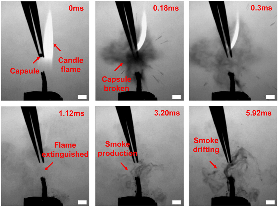 图4 高速相机捕捉的蜡烛火焰灭火过程:水基微胶囊响应明火释放细水雾,有效扑灭火焰后产生烟雾。比例尺:1 mm。