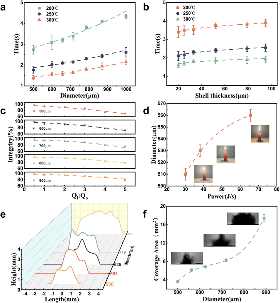 图5 尺寸与壳厚对水基微胶囊灭火及破裂特性的影响:(a) 不同环境温度下微胶囊直径与破裂响应时间的关系;(b) 不同温度下不同壳厚微胶囊的破裂响应时间;(c) 粒径范围与流速比对微胶囊结构完整性的影响;(d) 火焰功率与有效灭火所需微胶囊直径的关系及灭火过程;(e) 不同尺寸微胶囊破裂覆盖面积的三维轮廓图;(f) 微胶囊直径与破裂覆盖面积的关系。