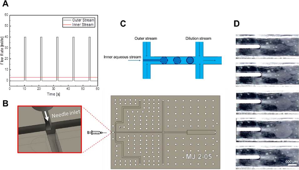 图1.(A)外水相流(9%脂肪醇聚氧乙烯醚硫酸钠、1%椰油酰胺丙基甜菜碱、1%氯化钠)的流速设置,脉冲流以40mL/h的流速持续1秒后停止10秒(脉冲时间可调整),循环往复;内水相流(0.1%壳聚糖、0.9%聚环氧乙烷、1%乙酸)以3mL/h或更高流速持续泵入。(B)微流控器件示意图,含针头适配结构。(C)微流控通道内微胶囊的形成示意图。(D)内相聚合物流通过针头缓慢注入微流控通道,此时表面活性剂流暂停,聚合物溶液形成准球形并稳定在针头尖端附近;在该静置阶段,聚合物-表面活性剂薄膜开始在聚合物液滴周围形成;当外相表面活性剂流恢复时,微胶囊脱离针头并向前推进。
