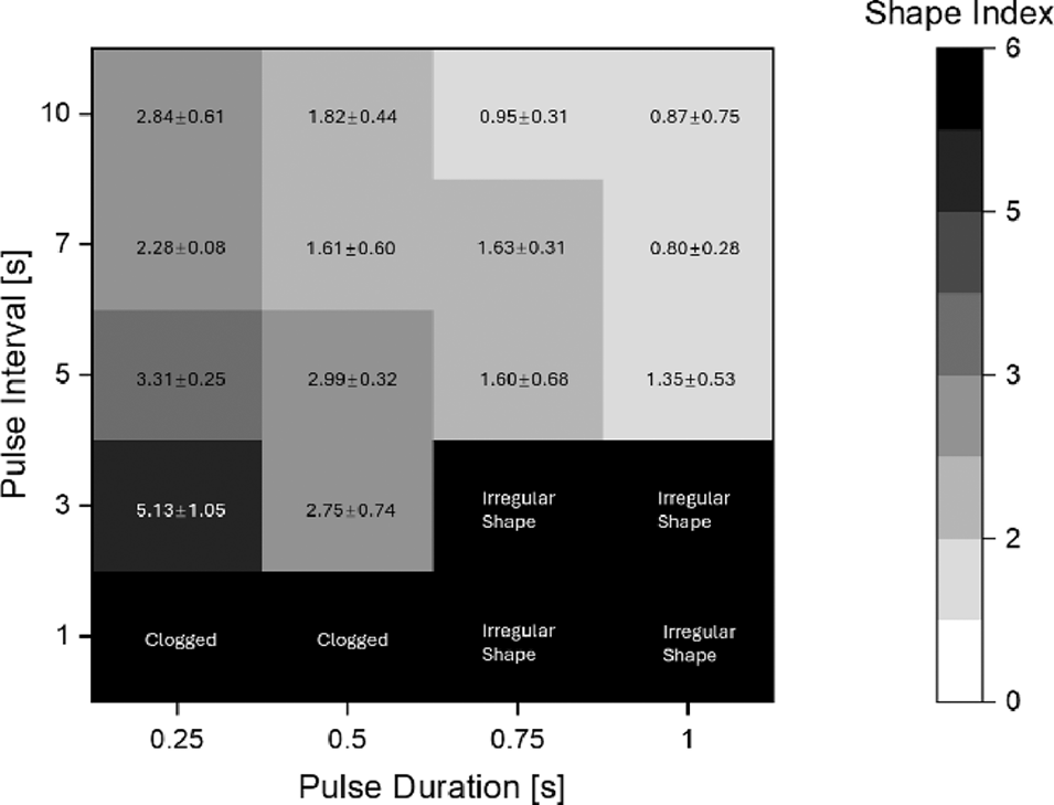图3. 微胶囊的存在状态及形貌分布图,以形状指数(尾长与微胶囊平均粒径的比值)表征,横坐标为外相流脉冲时长,纵坐标为脉冲间隔(所有其他参数保持不变)。所有微胶囊均通过广域光学显微镜测量,长度单位为微米;浅色轮廓代表形状指数更小,对应形貌更接近球形的微胶囊;深色区域代表形貌不规则的蠕虫状微胶囊,或出现内相流堵塞、无法形成完整微胶囊的情况。