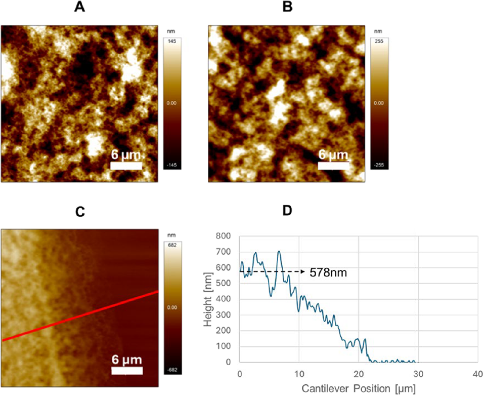 图4. 微胶囊干燥前的原子力显微镜形貌图:(A)空气中的微胶囊表面形貌;(B)浸泡在1%储存液中的微胶囊表面形貌;(C、D)空气中微胶囊边缘的原子力显微镜形貌及高度追踪(沿红色高亮线)。虚线箭头指示塌陷囊壳边缘的平均壳层高度,基底水平设为0,据此估算出壳层厚度约为289nm(为平均高度的一半)。