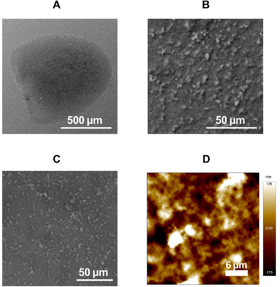 图5. 玻璃盖玻片上干燥后子弹形微胶囊的扫描电镜与原子力显微镜图像,样品在成像前经超纯水冲洗以去除残留表面活性剂和盐类:(A、B)不同放大倍数下微胶囊表面的二次电子图像,表面的凹凸不平可能源于胶囊制备过程中形成的凝聚层网络,或清洗过程中的部分溶胀/溶解;(C)背散射电子图像,显示微胶囊表面存在细微的成分差异,浅灰色区域表明原子序数更高的分子更易在此参与凝聚并发生后续沉淀;(D)同一样品的原子力显微镜形貌图。