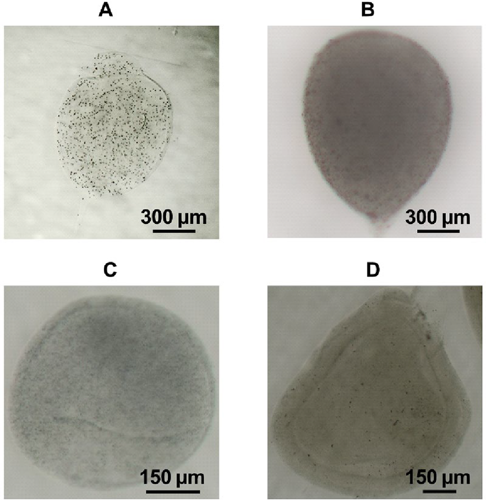 图7. Hirox光学显微镜拍摄的包封不同粒径聚苯乙烯微球的微胶囊光学显微照片:(A)5μm聚苯乙烯微球;(B)1μm聚苯乙烯微球;(C)800nm聚苯乙烯微球;(D)500nm聚苯乙烯微球。