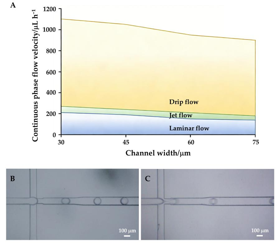 图3. 通道宽度与流速对水凝胶液滴形成的影响。(A)分散相流速固定为30μL/h时,不同通道宽度下连续相流速对应的流型图;通道宽度为75μm时,低(B)、高(C)连续相流速对液滴形貌的影响。