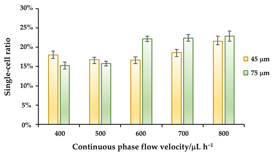 图4. 相同实验参数下,不同通道宽度制备的凝胶微球的单细胞包封效率。