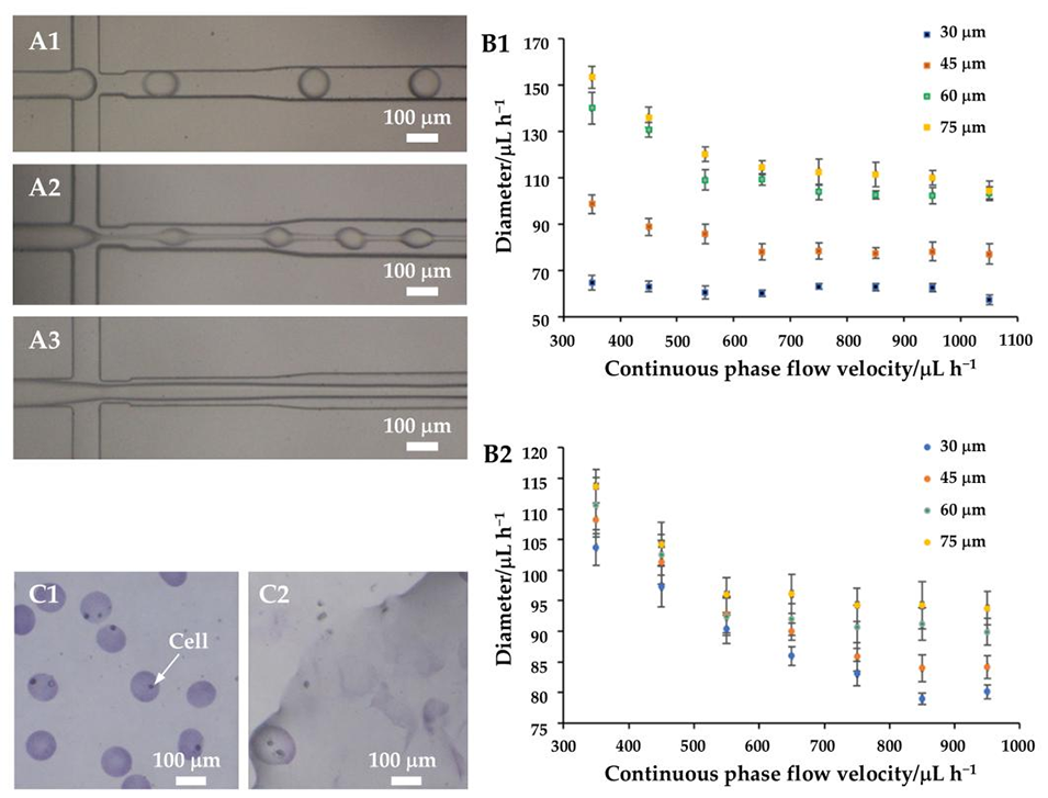 图5. 乙酸浓度对液滴及微球形成的影响。(A)流型变化:(A1)液滴形貌、(A2)珠串状结构、(A3)丝状结构。(B)分散相流速固定为30μL/h时,不同宽度芯片在不同连续相流速下制备的凝胶微球粒径:(B1)乙酸浓度0.2%(体积比)、(B2)乙酸浓度0.1%(体积比)。(C)乙酸浓度对载细胞凝胶微球的影响:(C1)乙酸浓度0.2%(体积比)、(C2)乙酸浓度0.1%(体积比)。