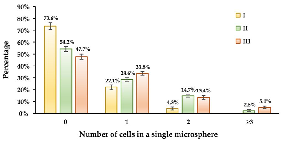 图6. 制备参数一致时,不同细胞密度制备的凝胶微球的细胞包封效率分布。