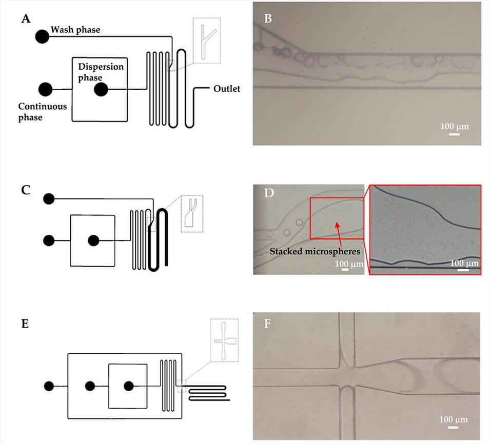 图7. 洗涤相通道结构对微球流动的影响。(A)单侧洗涤相通道微流控芯片示意图、(B)凝胶微球制备过程中的通道堵塞现象。(C)单侧加宽洗涤相通道微流控芯片示意图、(D)凝胶微球制备过程中的通道堵塞现象。(E)对称洗涤相通道微流控芯片示意图、(F)凝胶微球制备过程中的液滴有序流动状态。