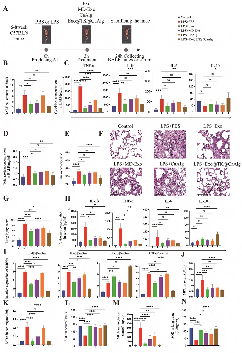 图6. Exo@TK@CaAlg水凝胶微球对脂多糖诱导的急性肺损伤小鼠肺部炎症、氧化应激、蛋白通透性及组织学损伤程度的治疗作用