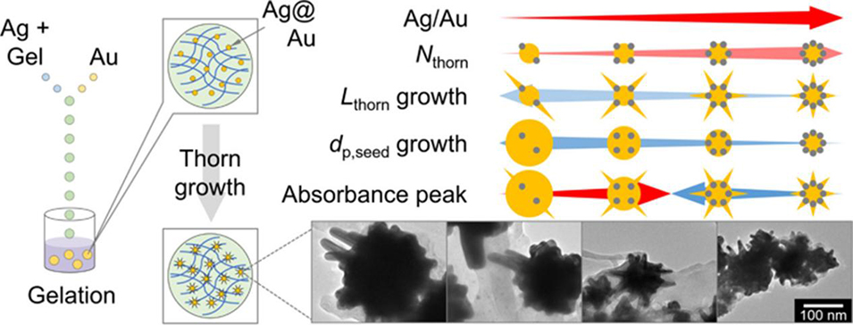 图8. 合成颗粒的透射电镜图像。(a)氯金酸浓度对刺生长的影响,银金摩尔比= 0.6 mol/mol(b)液滴碰撞时银金摩尔比对颗粒的影响,氯金酸浓度= 4 mM