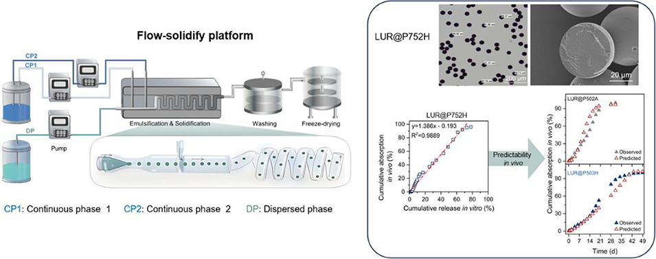 针对长效注射微球传统批量制备工艺存在的一致性差、难以建立可靠体外-体内相关性(IVIVC)的瓶颈问题,中国药科大学药学院刘东飞教授团队开发出一款端到端的连续流-固化制造平台,通过整合同轴毛细管可控乳化与双连续相超快速溶剂萃取固化两大核心模块,实现微球从液滴生成到固相成型的全程连续化、精准化控制。所得微球兼具结构均一、高药物负载率与优异的批次间一致性,为构建高预测性A级IVIVC模型奠定关键基础,也实现了可控制备工艺与可预测体内治疗效果的直接关联。相关研究以“Ultrafast solvent removal delivers high-loading of amorphous small-molecule drugs in polymeric microspheres with predictable in vivo performance”为题目,发表在期刊《Journal of Controlled Release》上。