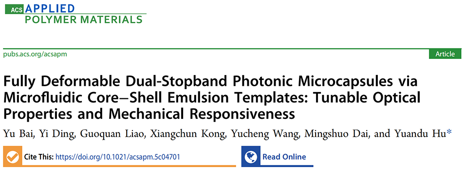 鉴于此,北京交通大学胡远渡教授团队通过微流控核-壳双乳液模板法制备出全可变形双阻带光子微胶囊,该微胶囊核层为PNIPAM-co-AAC水凝胶颗粒、壳层为含二氧化硅颗粒的PEGPEA树脂悬浮液,不仅克服了角度依赖问题,还实现了结构色可调,兼具温度和机械刺激下的可逆响应特性,且力学性能稳定、光学质量可通过外相渗透压优化,有效解决了现有材料的应用局限。相关研究以“Fully Deformable Dual-Stopband Photonic Microcapsules via Microfluidic Core–Shell Emulsion Templates: Tunable Optical Properties and Mechanical Responsiveness”为题,发表于期刊《ACS Applied Polymer Materials》。