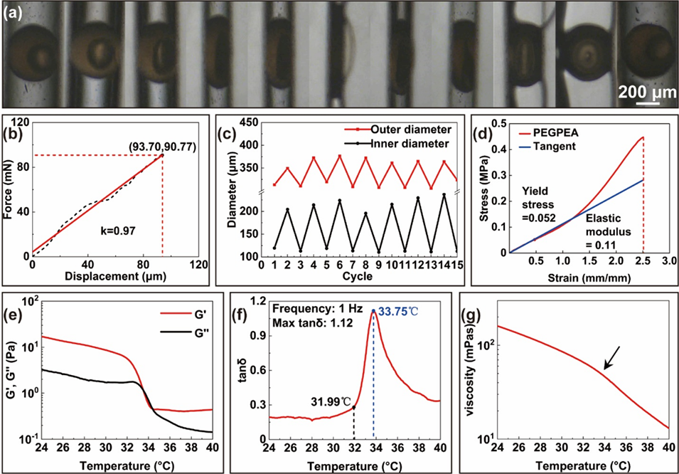 图6. (a) 微胶囊受压发生变形、撤去挤压力后恢复原始形貌过程的显微照片;(b) 微胶囊发生变形直至破碎过程对应的力-位移曲线;(c) 15次压缩-释放循环过程中微胶囊内外径的变化曲线;(d) 含25 vol%二氧化硅的PEGPEA的应力-应变拉伸曲线;(e) PNIPAM-co-AAC凝胶的储能模量(G′)和损耗模量(G″)随温度的变化关系;(f) PNIPAM-co-AAC凝胶的损耗因子(tanδ)随温度的变化关系;(g) PNIPAM-co-AAC凝胶的黏度随温度的变化关系