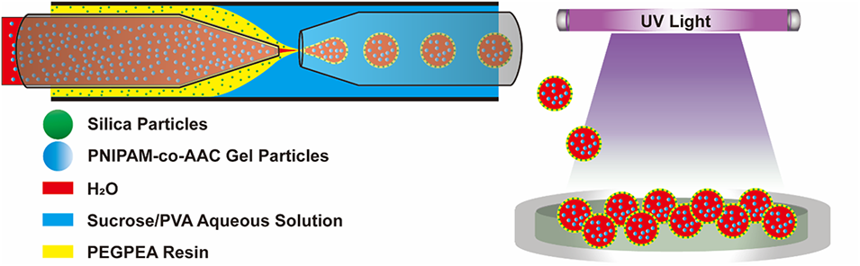 图1. 微流控技术辅助制备全可变形双阻带光子微胶囊的示意图