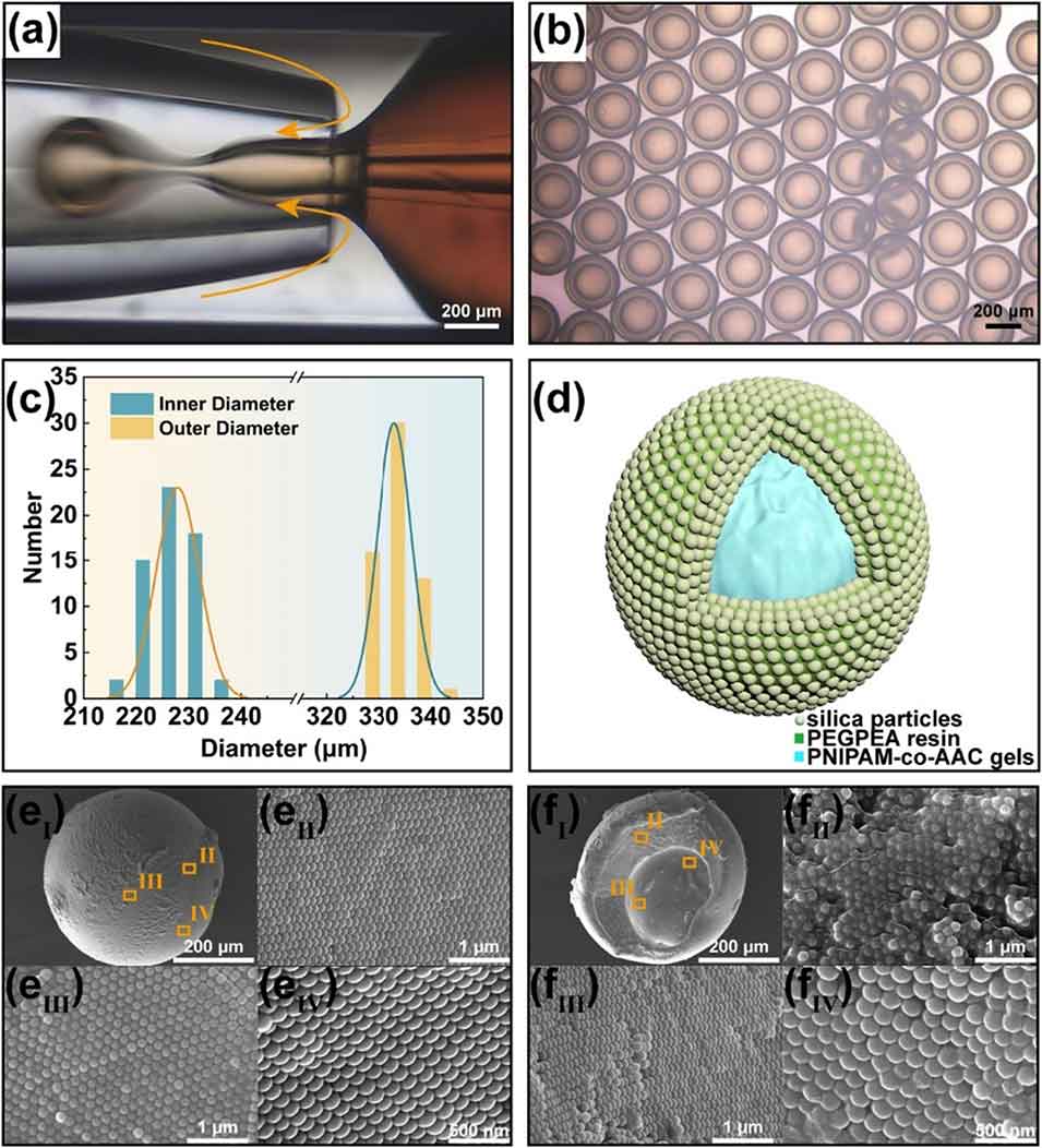 图2. (a) 微流控装置制备双乳液液滴过程的显微照片;(b) 所制得双乳液液滴的显微照片;(c) 双乳液液滴外壳与内芯尺寸的统计分布;(d) 微胶囊的结构示意图;(e) 微胶囊表面的扫描电镜图像;(f) 微胶囊横截面的扫描电镜图像