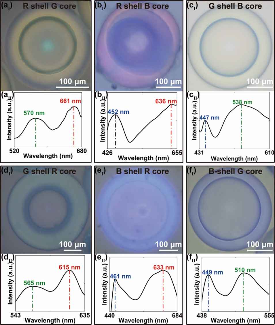 图4. 以核、壳悬浮液的不同组合制备六种不同的双阻带微胶囊。六种组合的显微图像及对应反射光谱如下:(a) 红壳-绿核;(b) 红壳-蓝核;(c) 绿壳-蓝核;(d) 绿壳-红核;(e) 蓝壳-红核;(f) 蓝壳-绿核